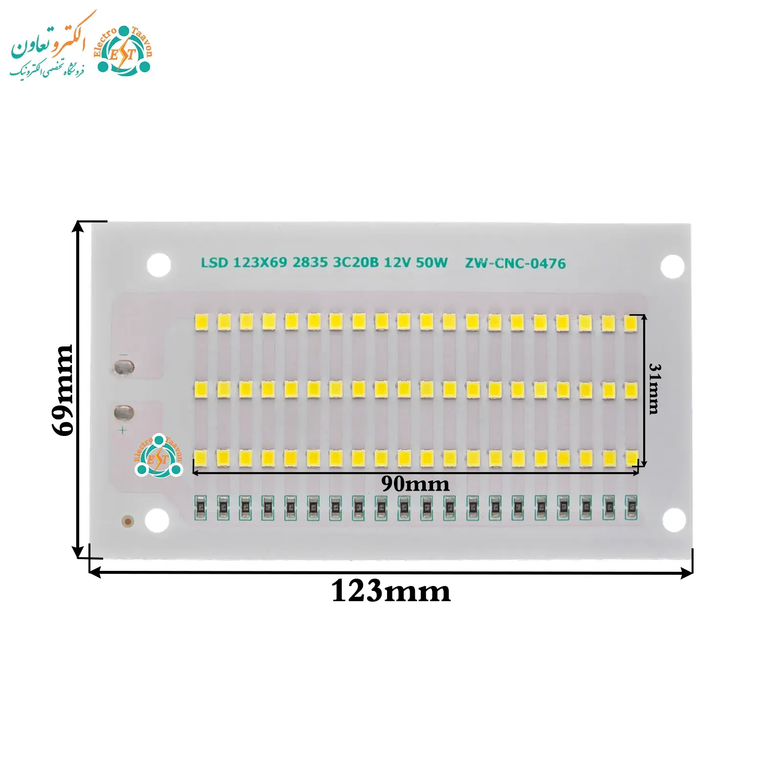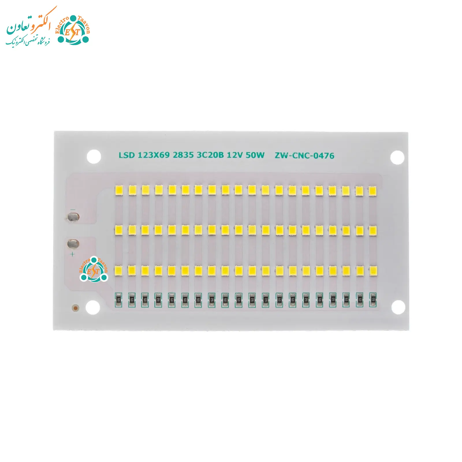 ال ای دی 50 وات 12 ولت پروژکتوری با نور سفید مهتابی (6000K)، یک چیپ قدرتمند و باکیفیت برای انواع پروژههای نورپردازی خانگی، صنعتی و خودرویی است.